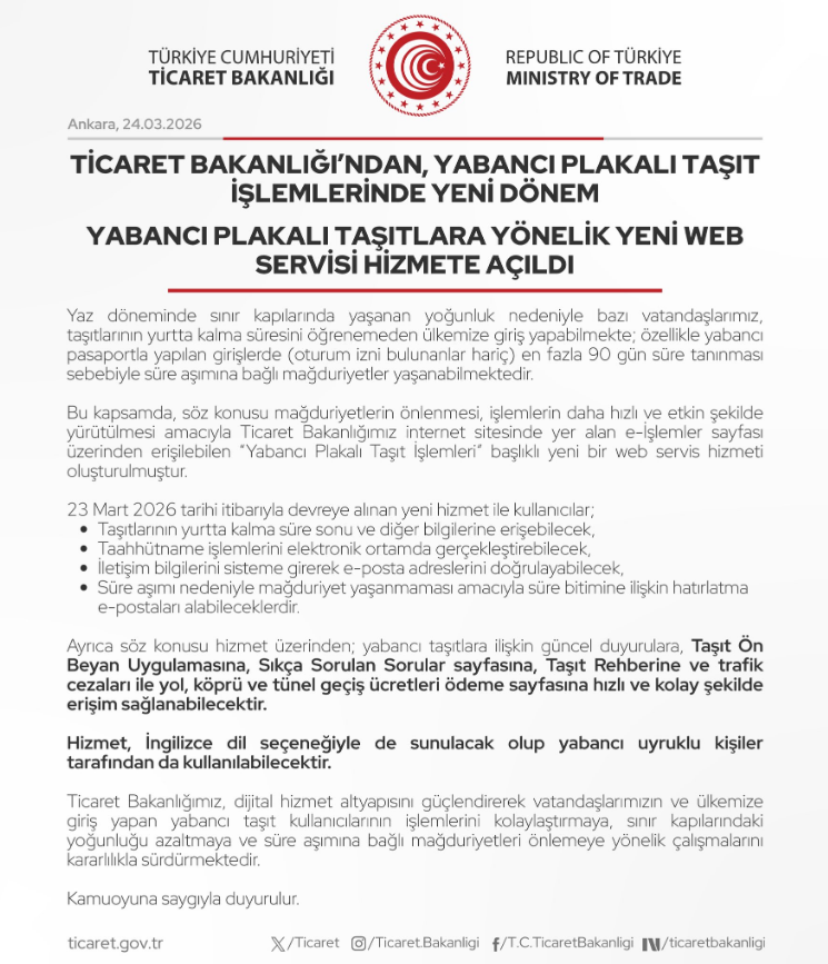 Ticaret Bakanlığımızın Yabancı Plakalı Taşıt İşlemleri hizmeti hakkında duyurusu ekte sunulmaktadır.